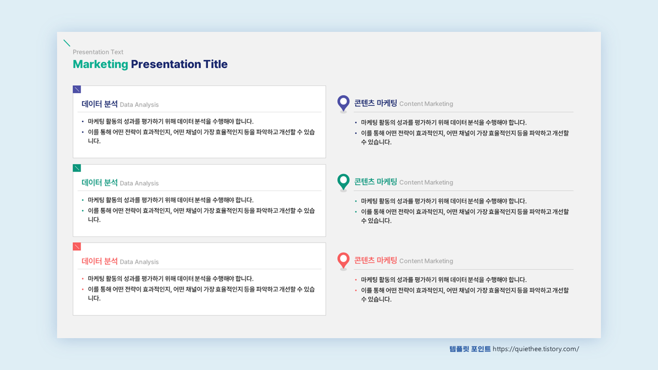 마지막 페이지는 가장 많이 사용하는 나열형식의 박스 레이아웃입니다. 이번부터 추가로 작업한 컬러별 도식들을 정리해 봤습니다. 이러한 템인트 템플릿의 사용범위 한번 더 확인해 보세요! 본 템플릿에는 비상업적, 비홍보적, 비영리 목적으로 한해서 무료입니다. 업무, 홍보, 영리 목적이라면 구매 부탁드립니다. 재배포, 판매, 복제는 금지입니다. 특히 외주제작, 판매를 법적 조치 진행할 것입니다. 본 템플릿을 다운받은 것은 사용범위에 동의한 것으로 간주합니다.