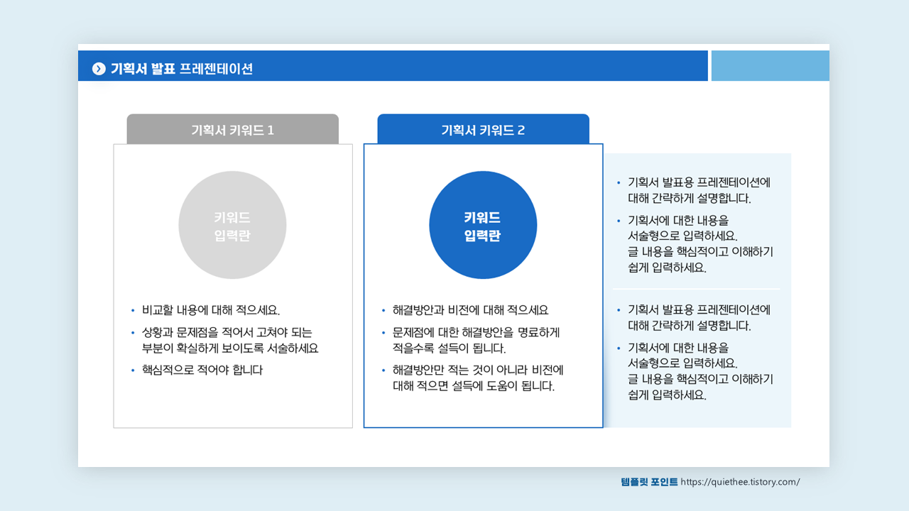그리고 비포,에프터와 키워드 나열 레이아웃입니다. 비포 에프터페이지는 이전의 문제점 등을 간단하게 적으시고 에프터 부분에는 문제점 해결 방안과 운영방안 등을 적으시면 좋습니다. 이전의 문제점은 핵심적인 부분만 간단하게, 이후 해결방안은 운영방안이나 앞으로의 미래전망 등까지 함께 적으면 좋습니다. 그리고 나열 부분은 해결방안에 대해 카테고리 등으로 필요한 부분을 자세하게 하나하나 적는다기 보다는 필요한 부분이나 장점 등을 카테고리처럼 키워드만 적어 나열하는 것입니다. 장점을 3가지 말고 어떤 곳과 협업이 가능하다, 운영이 편리하다, 장점이 있다 등을 카테고리처럼 나열해서 장점을 개수로 보여주는 형식입니다. 이전보다는 다양한 효과와 협업을 원하는 시스템에서 많이 사용하는 레이아웃입니다.