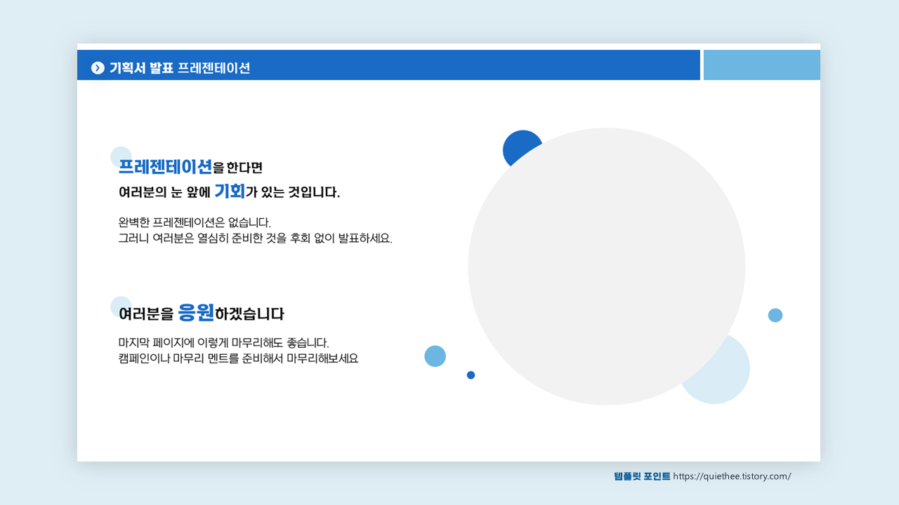 그리고 대망의 마지막 페이지. 마무리 멘트와 이미지를 넣으면 좋습니다. 이미지는 넣기 편하도록 이미지를 해당 원에 넣으면 자동으로 넣어집니다. 사용하기 편하게 만드는 것이 템플릿의 목적!