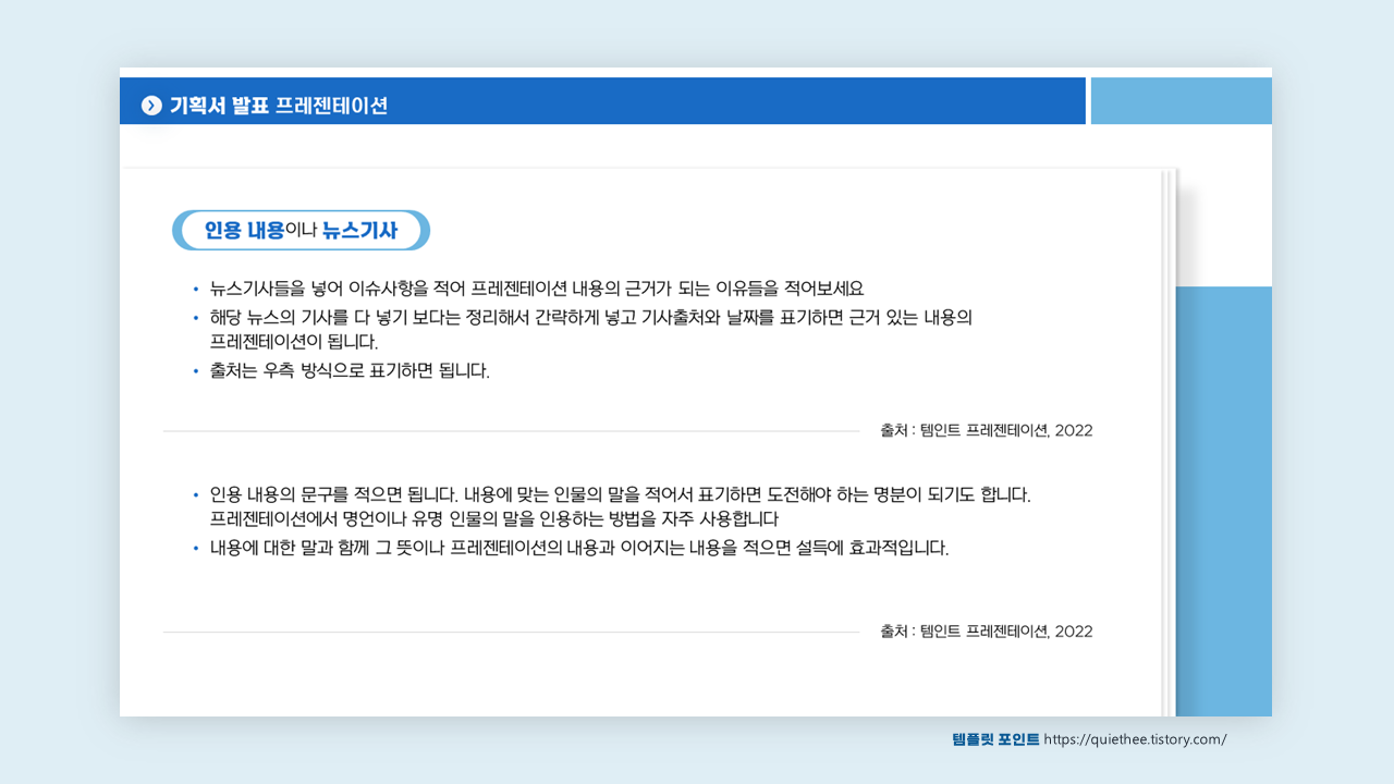 그다음은 기사나 명언 등을 인용할 수 있는 레이아웃입니다. 기사 내용의 타이틀과 중요한 내용들을 넣으면 프레젠테이션의 설득력을 높일 수 있습니다. 트렌드나 현상 등을 뉴스에서 가져오면 프레젠테이션 내용의 정당성이 높아지기 때문입니다. 여기서 뉴스는 2-3개 정도를 넣는 것을 추천드립니다. 현상을 보여주는 뉴스와 현상에 대해 유명인이 말하는 이야기로 넣는 방식을 많이 사용합니다. 뉴스를 넣으실 때 출처를 넣는다면 정보의 신뢰도가 더 높아집니다.