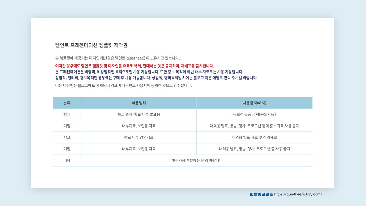 그리고 마지막으로 사용범위를 꼭 확인해주세요! 템플릿 마지막 장에 넣었으니 범위 확인하시고 사용하시길 바랍니다. 다시 한번 말씀드리지만 템인트 템플릿은 비상업적 무료이며 복제, 판매, 재배포는 금지입니다. 특히 외주, 판매 등은 절대 금합니다.